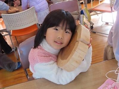 【肌触りも気持ちいい~。木のぬくもりを感じることができた子どもたちです。】