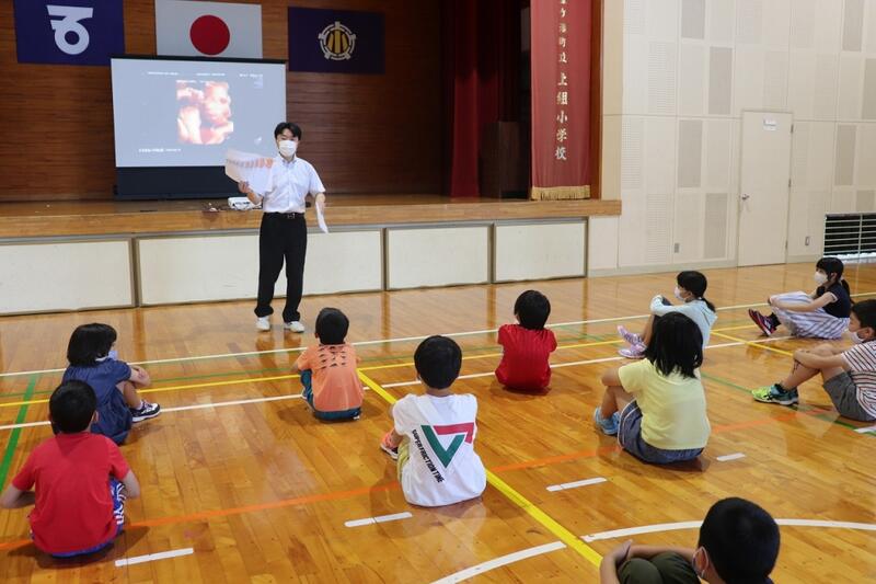 24日(水)、朝会で命を大切にする講話をしました。まずは担当の養護の先生からこの教育の説明があって、校長先生が赤ちゃんの誕生に関する話がありました。おなかの中にいる赤ちゃんの心音や産声を聞いたり、エコーや3Dの動画を見たりしながら、命の大切さについて体感しました。最後に自分の心臓の音を聞きながら、自分の命そして周りの人の命を大切にすることを学びました。この学習は毎学期実施する予定です。