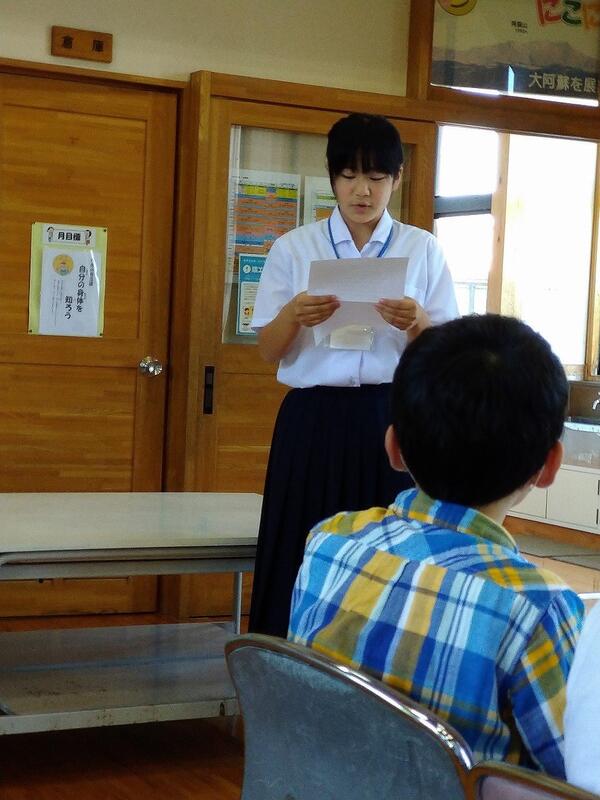 24日(水)から2日間、五ヶ瀬中学校2年生の職場体験学習で本校卒業生1名が来ています。これまで子どもの立場で見てきた学校を、教員の立場で見る、これがこの学習のねらいです。初日は朝会での紹介、授業参観、複数の先生からの講話と、立て続けに学習をしていました。そして給食後に全校児童の前で「先輩からのメッセージ」をしっかり話してくれました。「夢はまだしっかりとはもっていないが、お世話になった親への恩返しや五ヶ瀬町に役に立つことをしたい」という話が印象的でした。明るく、はきはきとした様子で、子どもたちもたくさん話をしに来ていました。これからの人生のために貴重な体験にきっとなることと思います。