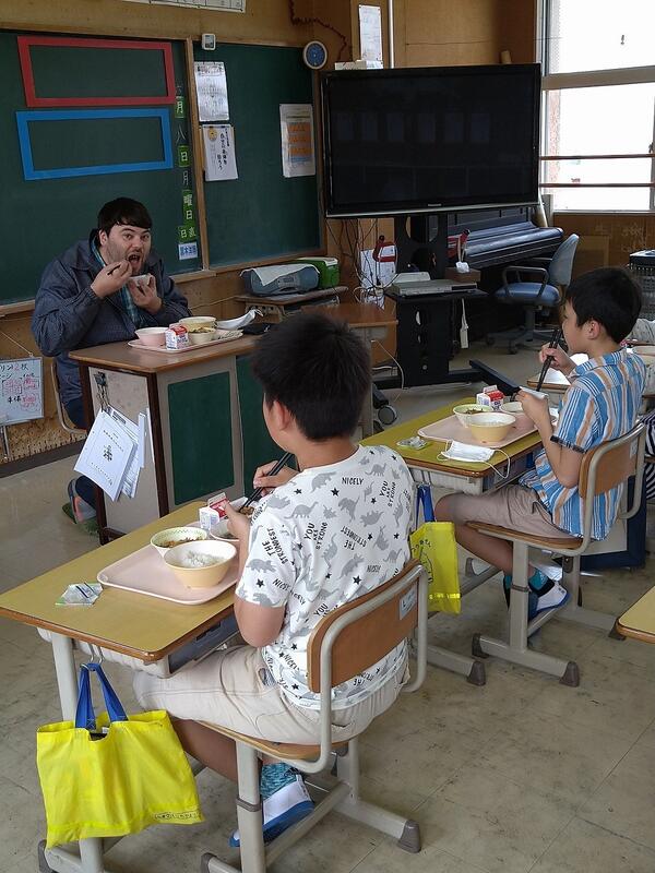 今日の給食で「納豆」が出ました。五ヶ瀬町が取組む「早寝、早起き、朝大豆」の典型的なメニューです。ちょうどALTの先生が来られていましたので、おいしい笑顔をパチリとしました。