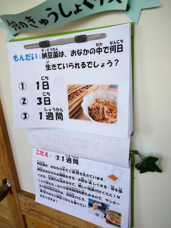 ところで本来であれば全校で給食をとるはずの多目的室。今は給食を取りに来る場所になっていますが、その廊下の掲示板に、毎日給食担当の先生がクイズをつくって貼ってくれています。給食メニューに関わるクイズを日替わりに考え、準備してくださることに頭が下がります。本日の給食クイズは「納豆菌は、おなかの中で何日生きていられるでしょうか?」でした。答えは下の写真で。
