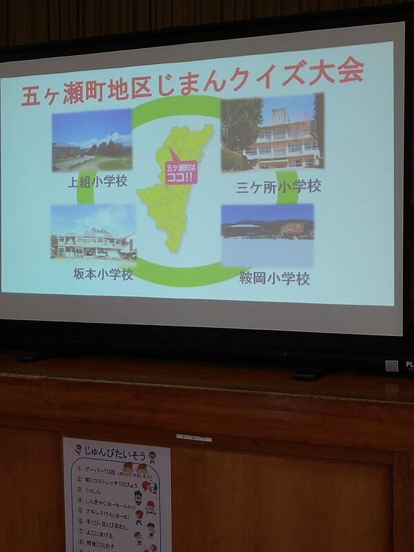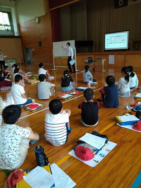 新型コロナウィルス感染症対策のため、五ヶ瀬町の小学校が学年ごとに一堂に会して学ぶ「G授業」。当初の計画より遅れましたが、5月中旬より徐々に実施されるようになりました。今日は5年生のG授業が三ケ所小学校でありました。本校6名も参加し、「五ヶ瀬のよさをたくさん味わって、五ヶ瀬ものしり博士になろう」のテーマのもと、今年度初回の学習(地区自慢クイズ大会)をしました。これから五ヶ瀬のよさを知るために、いろいろな場所を訪れることになります。五ヶ瀬の方々、よろしくお願いいたします。