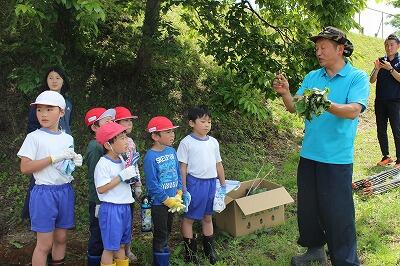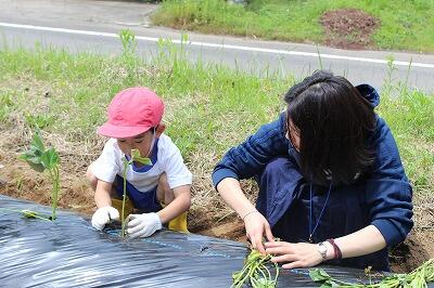 まず、講師の甲斐郁生さんに、苗の植え方を教えていただき、その後、安納芋