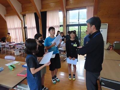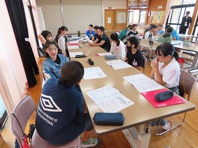 【まずは、宿泊学習で学んだ「五ヶ瀬の良さ」を確認中。(一人一人、発表していきました。)】