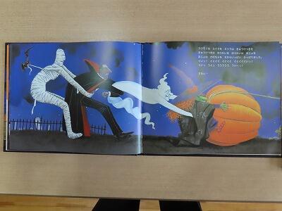 【おばけやミイラ、吸血鬼・・・、みんなでカボチャを引っ張る場面。どこかで読んだ本の内容に似ていて、みんな笑顔になりました。】