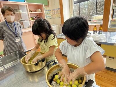 【収穫したたくさんの梅を加工していきます。お手伝いしていただいたのは・・・】