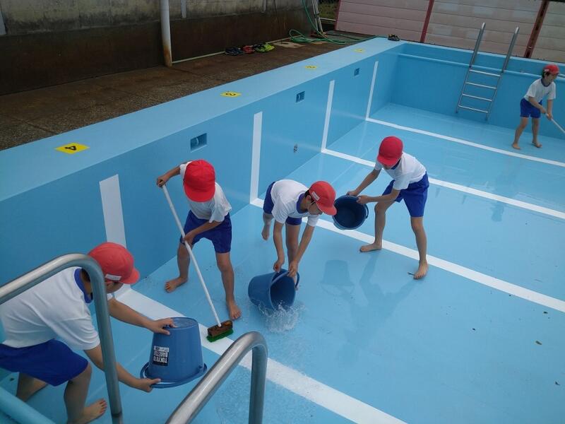 21日(木)、プール清掃を3~5年生11名と先生たちでしました。プールの中は改修工事が入り今年度はとてもきれいになっていて、例年に比べるとそこまで大変ではなかったのですが、みんなで力を合わせて清掃しました。中にはしりもちをついて、びしょぬれになる人も…。6月16日からプールが始まります。元気で泳ぎ回る姿が今から楽しみです。