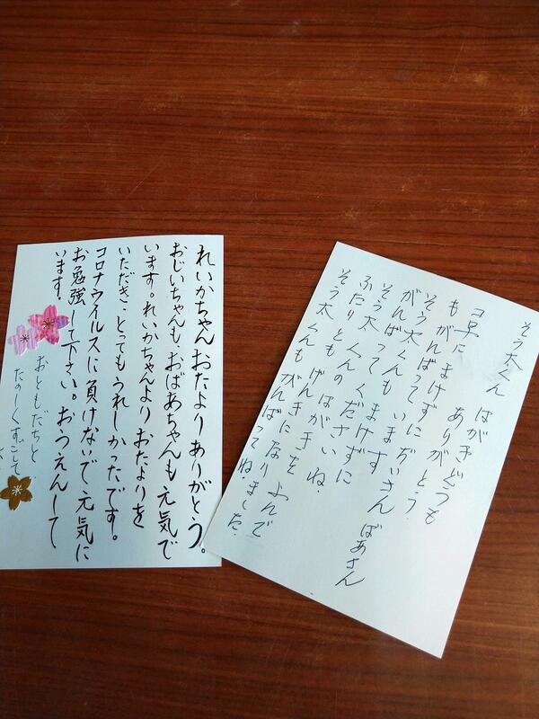 5月の連休中に「今だからこそ、みんなで応援し合うプロジェクト」の取組で、子どもたちが地域の高齢者のみなさんへはがきを書いて送りました。先日、そのお返事をいただきました。とても温かい内容で、早速本人へ届けました。心がほっとする時を共有できました。ありがとうございます。