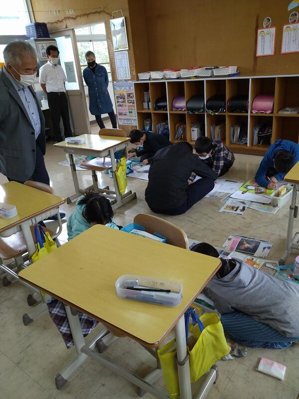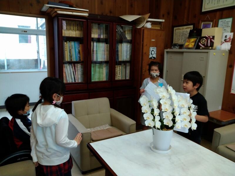 昨日、1・2年生が校長室を訪ねてきました。少し前に2年生が学校探検の説明をするために、校長室や職員室、保健室の取材に来ましたが、その内容を1年生に教えました。2年生が工夫した質問を1年生が答える形でしたが、とても微笑ましい様子だったので、思わず写真に撮りました。先輩となって少しお兄さんお姉さんになった2年生、その説明をしっかり聞く1年生。この瞬間、とてもすがすがしい風が吹いた気がしました。