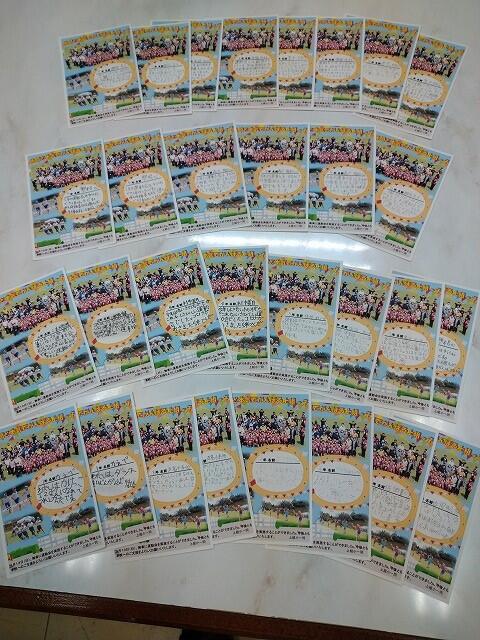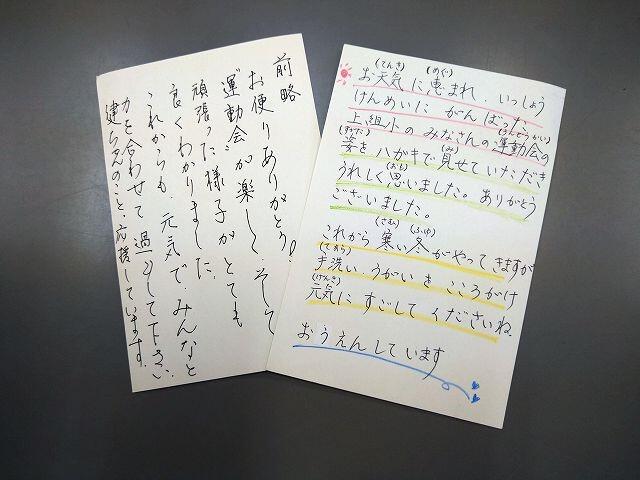 運動会プロジェクトで「地域の方々に元気と笑顔を届けよう」と運動会で来賓としてお呼びする方々に、先月子どもたちのメッセージが入ったはがきを送りました。そのお返事のはがきが先日学校に届きました。とても温かい言葉が書かれていて、心がほっとしました。ありがとうございました。