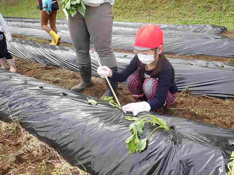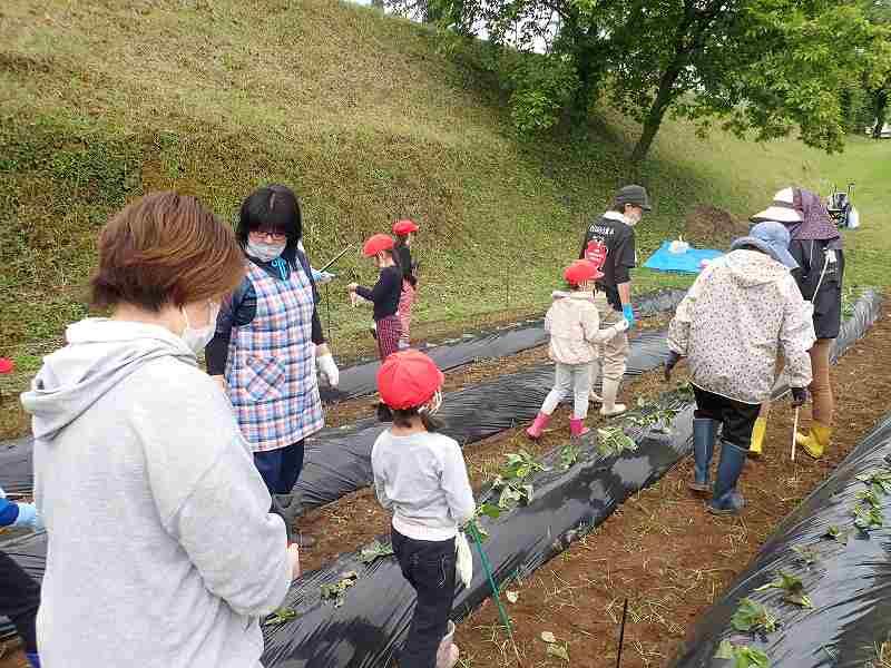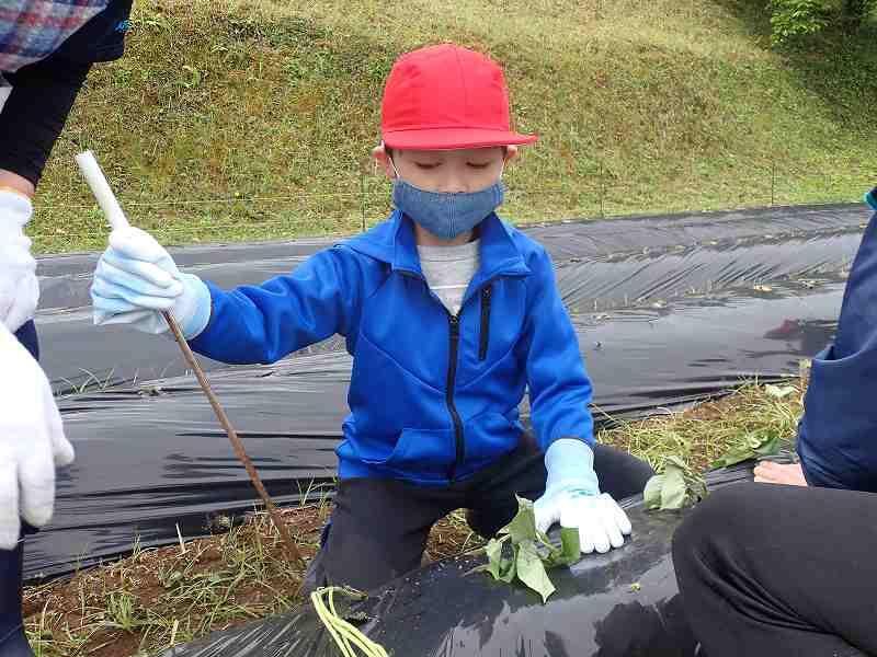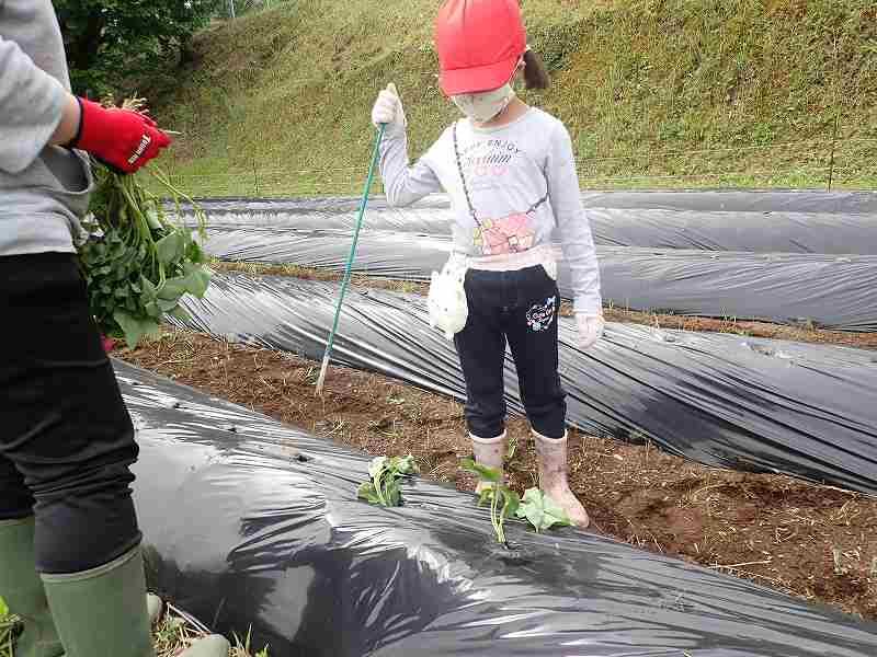 本日(28日・金)の2校時に、1・2年生で芋の苗を植えました。昨日までの雨天で実施が心配されましたが、