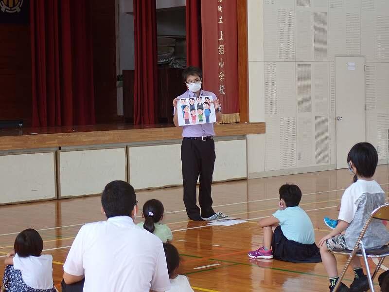 8月3日(火)は、夏休み中の登校日でした。上組小の子ども達と先生達が全員元気に