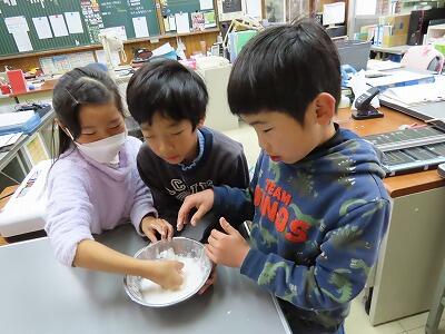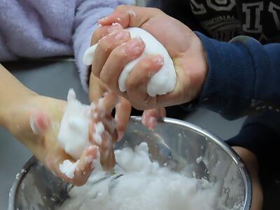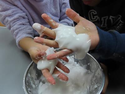 【ダラ~~ン。防弾チョッキにも応用されているダイラタンシー現象ですね。片栗粉と水だけでできる不思議な実験を楽しんでいました。】