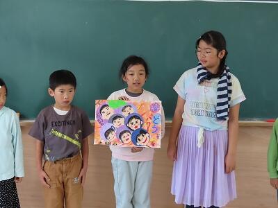 【「気をつけ」「今から上組小の発表を始めます。」】