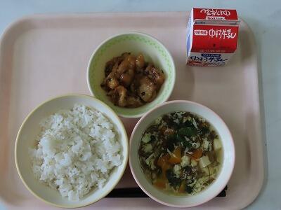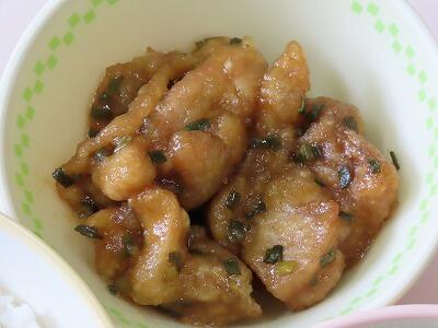 もともとは、鶏一羽丸ごと油で揚げる料理ですが、給食では切った鶏肉に下味をつけ、粉をつけ、一つ一つ揚げて、ネギやしょうがの入った甘酢ソースをからめて作るそうです。