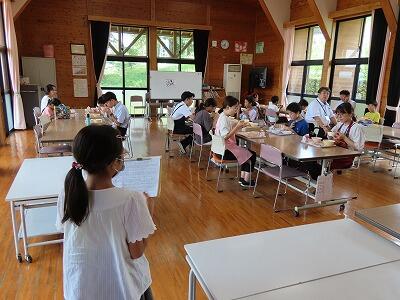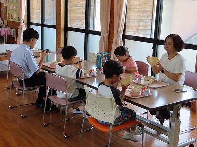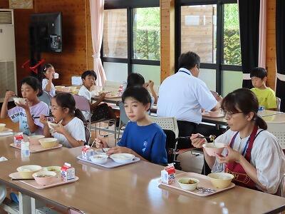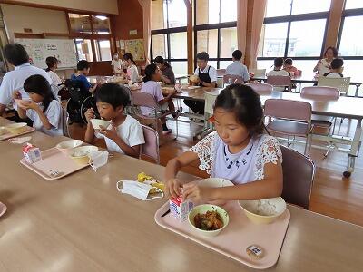 【上組小ならでは・・、子どもも先生もみんなで楽しく食べる給食時間】