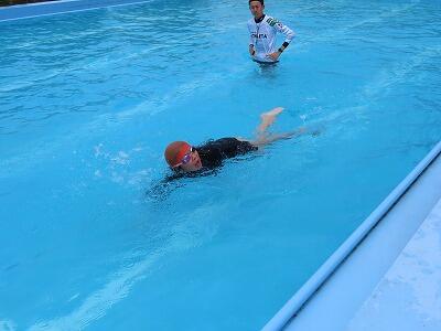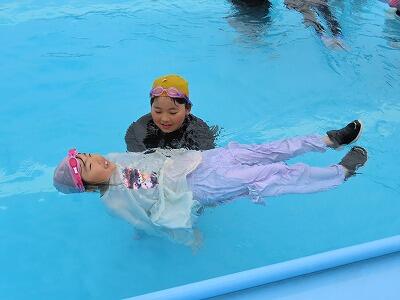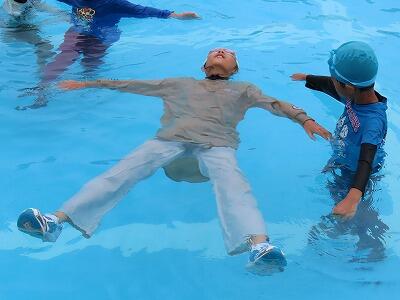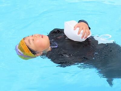 海や川で、服を着たまま入水し、おぼれそうになった時を想定し、命を守るための術を学びます。