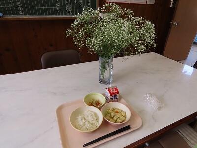 昨日、保護者の方からいただいたかすみ草を飾ると、さらに給食がおいしく、豪華に見えますね。