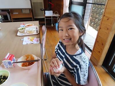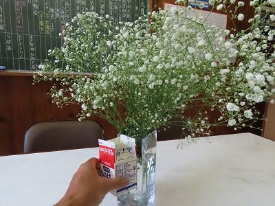 昨日、保護者の方からいただいたかすみ草を飾ると、さらに給食がおいしく、豪華に見えますね。