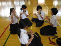 5・6年生の総合的な学習の時間では地域の伝統芸能の継承について学んでいます。その中の一つである「若宮神楽」の学習が6月22日(水)から始まりました。舞い手、笛、太鼓に分かれて練習をします。保存会の方と昨年度経験している6年生が、初めて学ぶ5年生に指導をします。保存会から子どもたちへ、上級生から下級生へと伝統をつないでいきます。