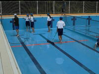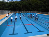 水泳学習に向け、プール清掃をしました。幼稚園児から9年生までが使うプールです。