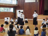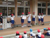 次は「集団行動」の練習です。「気をつけ」「礼」「まわれ右」等の動作のポイントを団長が説明します。みんなポイントを意識して取り組んでいました。園児や1年生に丁寧に教えている上級生の姿も見られました。同じ目線で分かりやすく、さりげなく行動できる9年生、恐るべし!