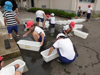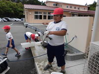 新しいプールではありますが、「きれいなプールに!」とみんな一丸となってゴシゴシ力を入れ、ワイワイ楽しく磨きました。