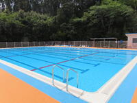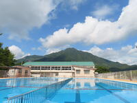 プール清掃を終え、プールの水が満水です。プールの壁が「青」なので、思わず「きれい~」と口に出てしまうほどの美しさ! そして、なんと言ってもここから眺める「権現山」(ごんげんさん)は圧巻!