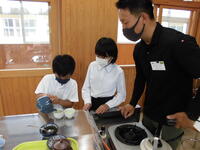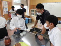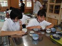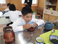 今回は5年生。家庭科で、1.座学 2.お茶の入れ方実践 3.お茶の飲み比べ の流れで学習を進めました。子どもたちは「煎茶」「釜入り茶」「紅茶」を飲み比べ、同じ茶葉から味や風味の全く違う「茶」ができることに驚いていました。
