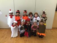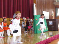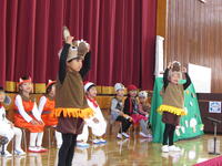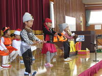 10月25日(水)に行われる文化発表会に向けて、練習に取り組んでいる子ども達です。今年の発表会は何にしようかとみんなで話し合った結果、「ブレーメンの音楽隊」になりました。役決めになると、なぜかネコが大人気!何度か話し合いを重ねる内に、「イヌもかわいいね」「泥棒になろうかな」という声も聞かれ、無事に役も決まりました。今は、本番に向けて踊りや歌、セリフを覚えています。発表会の目標は、「大きな声で元気よく発表する」です。来ていただいた観客の皆様に笑顔になってもらえるよう頑張りたいと、気合いも入っています。是非25日(水)は、園児のかわいい姿を見にいらしてください。