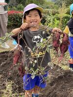 11月6日(月)に、芋掘りをしました。6月初めに暑い中一生懸命に植えたサツマイモの苗ですが、早い段階でシカ?かサル?に葉っぱを食べられてしまい、思うように生長してくれませんでした。全体的に小ぶりなお芋となってしまいましたが、土の感触を思いきり味わいながら楽しく芋掘りしました。持ち帰ったお芋を「焼き芋にしたよ」「かりんとうにして食べたよ」などと教えてくれました。秋の恵みに感謝です。
