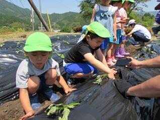 1日(火)に正面駐車場横の畑に芋の苗を植えました。去年のまでの経験もあるので伝えた手順通りに手際よく植えることができました。園庭からも成長を見ることができる場所です。大きく育ってくれるといいですね。