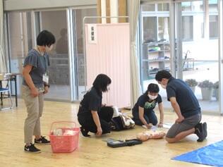 9日(水)に職員研修でJEMSの方に来ていただき、心肺蘇生法講習会を開きました。再度、いざというときの手順や胸部圧迫法について講義や実習を行いました。毎年行ってはいますが、水泳シーズンを前に再確認できて良かったです。最後はアクションカードを使った救急時対応についても実践しながら意見交換できました。