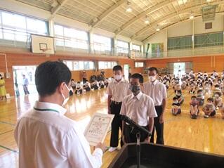 23日(水)朝の全校朝会で先日行われた地区中総体の表彰を行いました。表彰のあとは、部活ごとに、県大会に向けた熱い思いも述べてくれました。全校からの激励を込めた大きな拍手が本番でのパワーに繋がってくれることを願っています。その他、英検の表彰も行いました。こうした一人一人のがんばりをこれからも積極的に表彰していきます。
