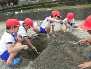 8日(木)の図工の時間に、砂場で活動を行いました。山を作ったり、トンネルを掘ったりといろんなアイデアを出しながら時間を忘れての活動でした。手や足だけでなく顔も真っ黒になった1年生でした。