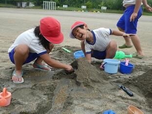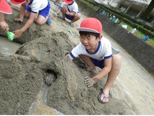 8日(木)の図工の時間に、砂場で活動を行いました。山を作ったり、トンネルを掘ったりといろんなアイデアを出しながら時間を忘れての活動でした。手や足だけでなく顔も真っ黒になった1年生でした。