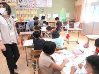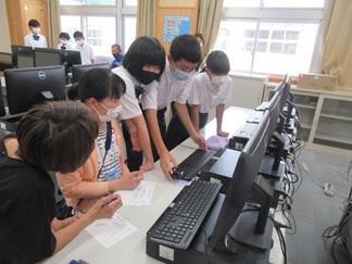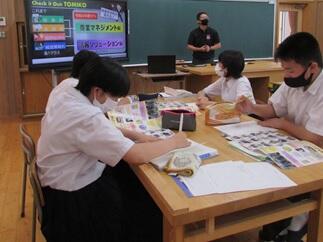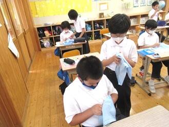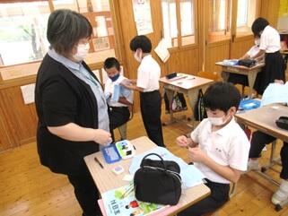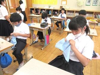 5年生は今年度から家庭科の授業が始まりました。今は裁縫セットを使ってボタン付けやいろいろな縫い方について学習しています。慣れない作業に苦労している様子もありましたが、友達と教え合いながら楽しく授業を進めていました。