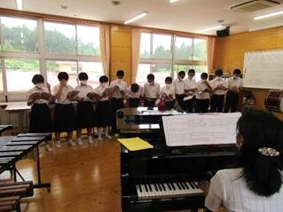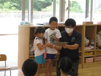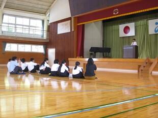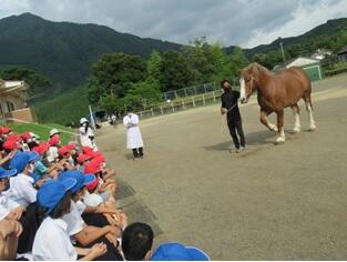 6日(火)に町の教育委員である大野さんが飼育されている新馬の「ゴン」と「ゲン」が学校に来てくれました。間近で見る2頭は想像以上に大きく感じたようで「大きい」「すごい」の声があちこちから聞こえました。今年の御田祭で見ることができなかったのは残念ですが、来年を楽しみにしたいと思います。