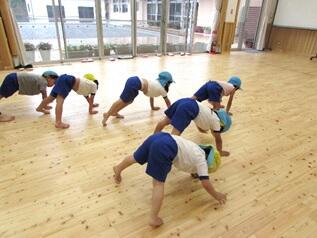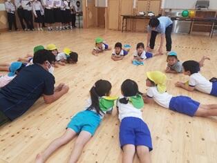 梅雨に入り雨が続きますが、子ども達は元気いっぱいです。18日(火)は多目的ルームで幼稚園生が「運動遊び」を行いました。体の色々な部分を使った動きをしたり、用具を使ったりして2時間たっぷり運動しました。いろいろな動きがあって子ども達も楽しんで参加していました。