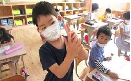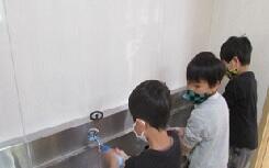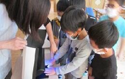 コロナウイルス感染症の拡大で、テレビなどでも繰り返し「手洗いの徹底」が求められ、子ども達一人一人の意識も高まっています。そこで今回はこれまでの手洗いを振り返る意味で、幼稚園や1・2年生教室で養護教諭とのティームティーチングの授業を行いました。洗い残したところが光るローションを塗ってから普段通りに手洗いをしたのですが、終わった後に手を見てみると洗い残しが目に見えて分かりました。子ども達も視覚的に実感でき、「もっと丁寧に手洗いをしよう」と意欲が高まっていました。