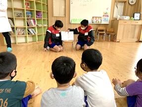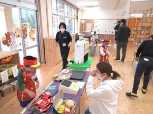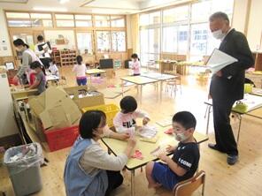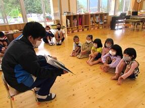 20日(水)のフリー参観に合わせて8年生が家庭科の授業で幼稚園で保育実習を行いました。幼稚園生が喜んでくれるようにとアイデアを出し合い、読み聞かせや人形劇、運動場での遊びなどあっという間の2時間となり、十分にめあてを達成できました。普段から交流のある8年生が来てくれて、幼稚園生もすごく喜んでいました。