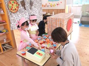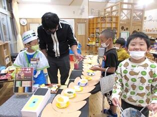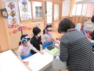 21日(木)のフリー参観に合わせて幼稚園生が「お店屋さん」を開店しました。開きたいお店を決めるというとことからどうやって売っていくか、お店の名前はどうするかなど、子ども達がアイデアを出し話し合いをしながら、ずっと準備してきました。買い物はカードで行うなど、今の時代を反映したお店屋さんでした。開店と同時に多くのお客さんが来て、子ども店長、副店長として丁寧な接客でスマイルもたくさんいただきました。