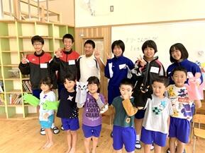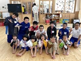 26日(火)は3園交流会の一環としてヴェロスクロノス都農から4名の方に来ていただき、サッカー教室を行いました。はじめは緊張していましたが、慣れてくると夢中になってボールを追いかけていました。他園との交流も深まり、園児の笑顔と歓声いっぱいの運動場でした。