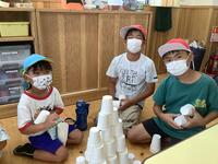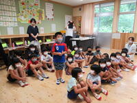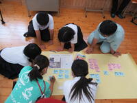 4年生は総合的な学習の時間で福祉をテーマにしています。その中で7月13日(水)に幼稚園児への福祉活動を行いました。目的は「幼稚園児を楽しませて、幸せになってもらうこと」でした。一緒に遊んだり、ポスターを作ったりしてみんな笑顔でした。最後に撮った集合写真からも目的が達成できたことが分かります。