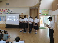 8年生が修学旅行で長崎を訪れた際に、被爆者の方から直接お話を聞き、「自分たちも平和のバトンをつなぎたい」という思いから全校の園児児童生徒へ向けての平和学習を企画し、7月20日(水)に実施しました。幼稚園児・1・2年生、3・4年生、5年生以上と対象を3つに分け、発達の段階にあわせて、絵本の読み聞かせをしたり、戦争の説明や群読をしたりしました。8年生の強い想いが伝わり、聞く方も真剣なまなざしでした。