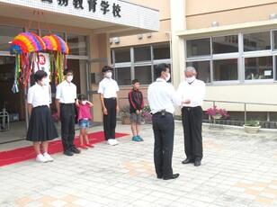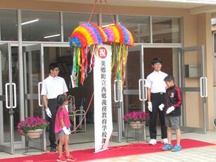 18日(金)に開校記念式典を無事に終えました。神事の後、テープカットやくす玉割りで開校を祝いました。コロナウイルス感染症対策の関係で規模を縮小した形になりましたが、施設も完全な形で「西郷義務教育学校」のスタートを切ることができました。体育館の式典では新校歌も初披露し、心を一つにした歌声が体育館中に響き渡りました。