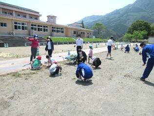 10日(月)に全校クリーン活動として運動場の草取りを行いました。近ごろ気温も上がり、運動場の草も一気に伸び始めたので第1回目として行いました。なかよし班に分かれ、幼稚園生から9年生までたくさんの草を抜いてくれたおかげで、短時間で運動場がずいぶんきれいになりました。
