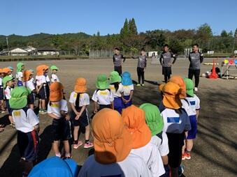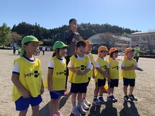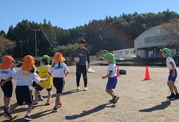 26日(火)は3園交流会の一環としてヴェロスクロノス都農から4名の方に来ていただき、サッカー教室を行いました。はじめは緊張していましたが、慣れてくると夢中になってボールを追いかけていました。他園との交流も深まり、園児の笑顔と歓声いっぱいの運動場でした。