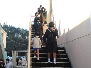 28日(金)は学校運営協議会委員で金柑農家の若藤さんの協力を得て、金柑ちぎりの体験学習を行いました。一つ一つ丁寧に収穫できました。最後は全員に収穫した金柑をいただきました。ありがとうございました。【石段登りの様子】
