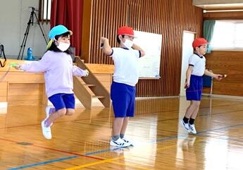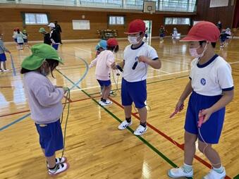 今週から1・2年生と幼稚園生との合同なわとび交流会を行っています。グループで練習を進めており、丁寧に教えている1・2年生と笑顔で学ぶ幼稚園生とで和やかな雰囲気ができています。ています。会を重ねたことの相乗効果で技術の向上も見られています。来週の発表会も楽しみです。